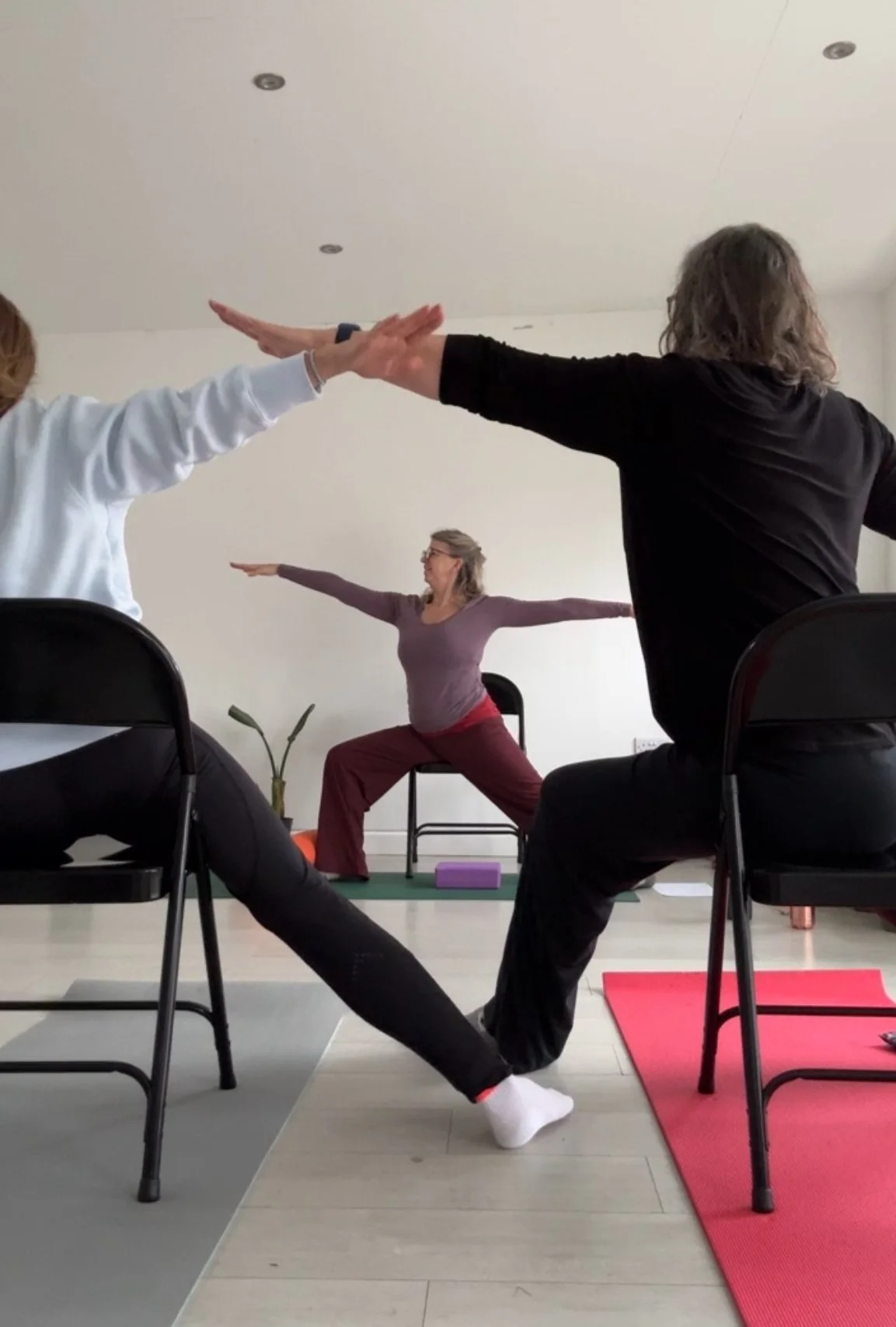 All poses are thoughtfully modified to be accessible and supportive. Chairs and other props are available and can be used seated or standing for added stability, balance, or rest - allowing you to move safely and comfortably at your own pace.